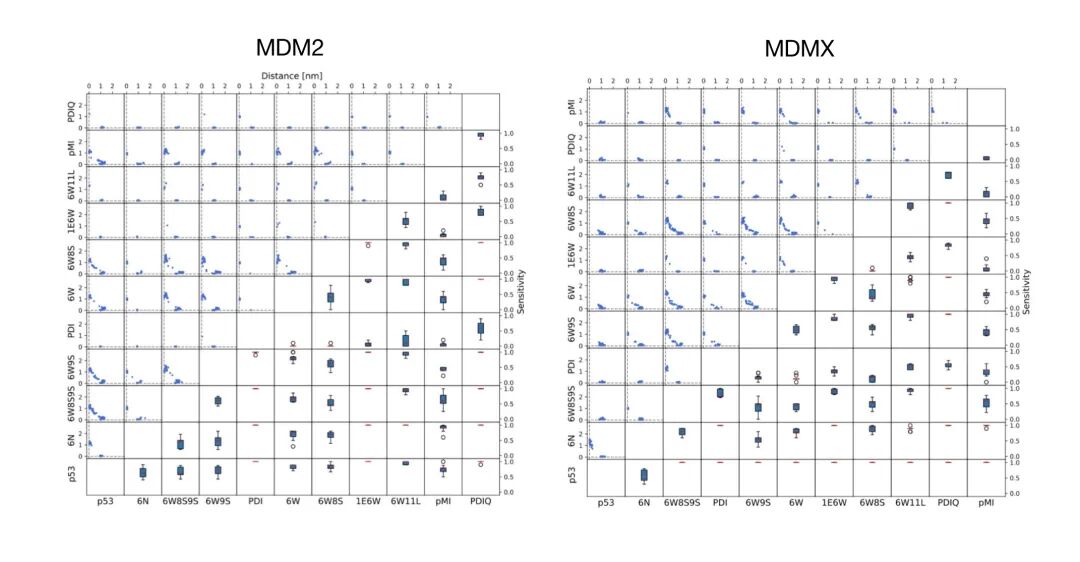 但令人兴奋的是,AF2虽然对突变不够完美,但能够正确地对几组多肽的结合力进行排名:同样PDIQ、6W11L、1E6W、PDI结合最强的多肽被筛选出来,而pMI、6W8S排名效果较差(每组测试中都存在2个cluster)。目前来看至少对亲和力存在几倍差异的案例有几率被识别出来。