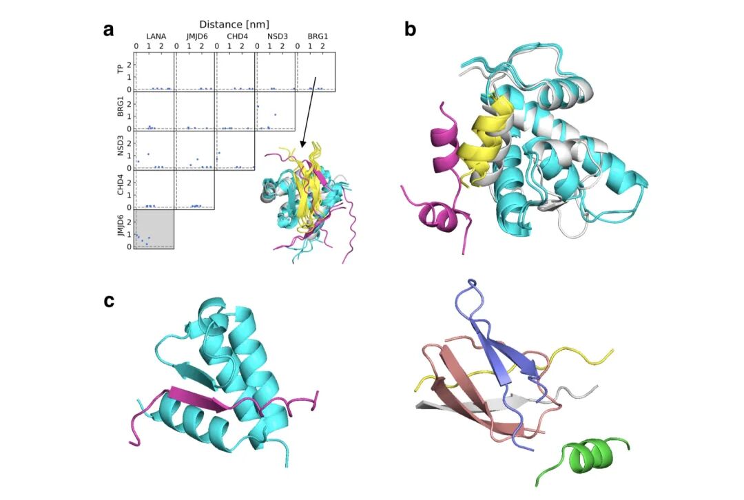 对于ET domain体系,作者采取两两组合的方式预测6个复合物体系的排名情况。AF2准确地预测出了6条多肽中3条的亲和力最强排名顺序(Kd: 0.1, 8 and 10 µM),而对于后三条结合力较差的多肽顺序不够明朗((Kd: 95, 160, 635µM)。通过构象分析,CHD4和LANA评估结合力类似,其主要构象为beta折叠片,并且受体之间的疏水相互作用要少得多。