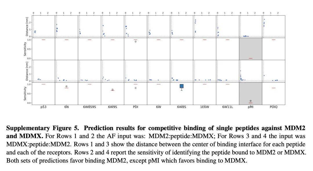 而在MDM2/X的体系中,多肽序列的相似性其实非常的高,也就是说关键的PPI残基并没有太大的变化。因此作者并不确定这种竞争的方法能否反映结合力,并且更糟糕的是,测试组中存在3条无活性的序列,AF2都错误预测了实际的复合物结构。因此AF2对突变不敏感的问题可能会在该方法中放大!