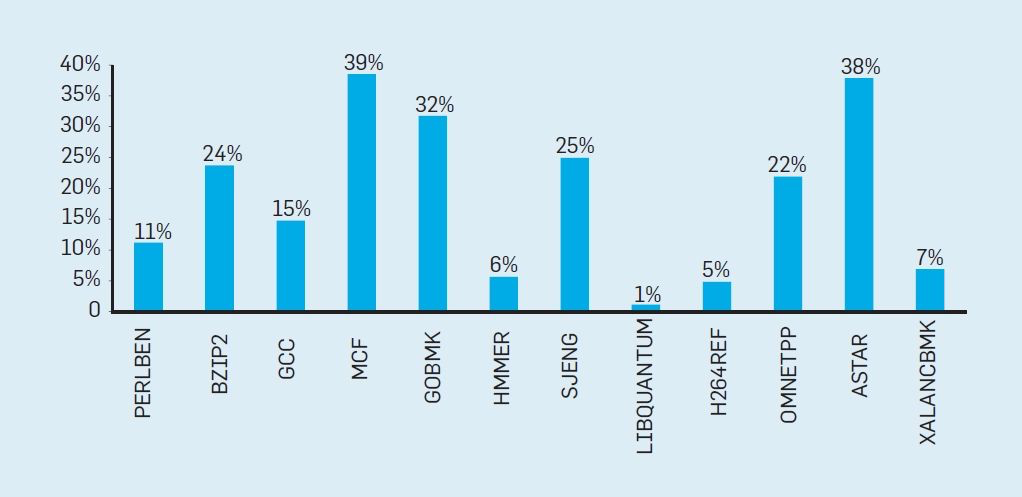 要理解这些无用功叠加起来是什么结果,可以参见图 4 中的数据。图 4 显示了有效执行的部分指令,这部分指令由于处理器推测错误而变得无用。在英特尔酷睿 i7 基准测试上,19% 的指令都被浪费了,但能耗的浪费情况更加严重,因为处理器必须利用额外的能量才能在推测失误时恢复原来的状态。这样的度量导致许多人得出结论,架构师需要一种不同的方法来实现性能改进。于是多核时代就这样诞生了。