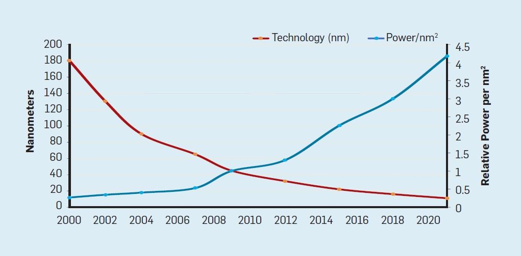 图 3. 每个芯片上的晶体管及每平方毫米的能耗。