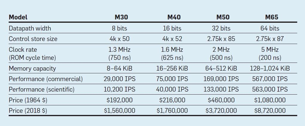 表 1:IBM System/360 系列四个型号的特性;IPS 表示每秒执行指令数。