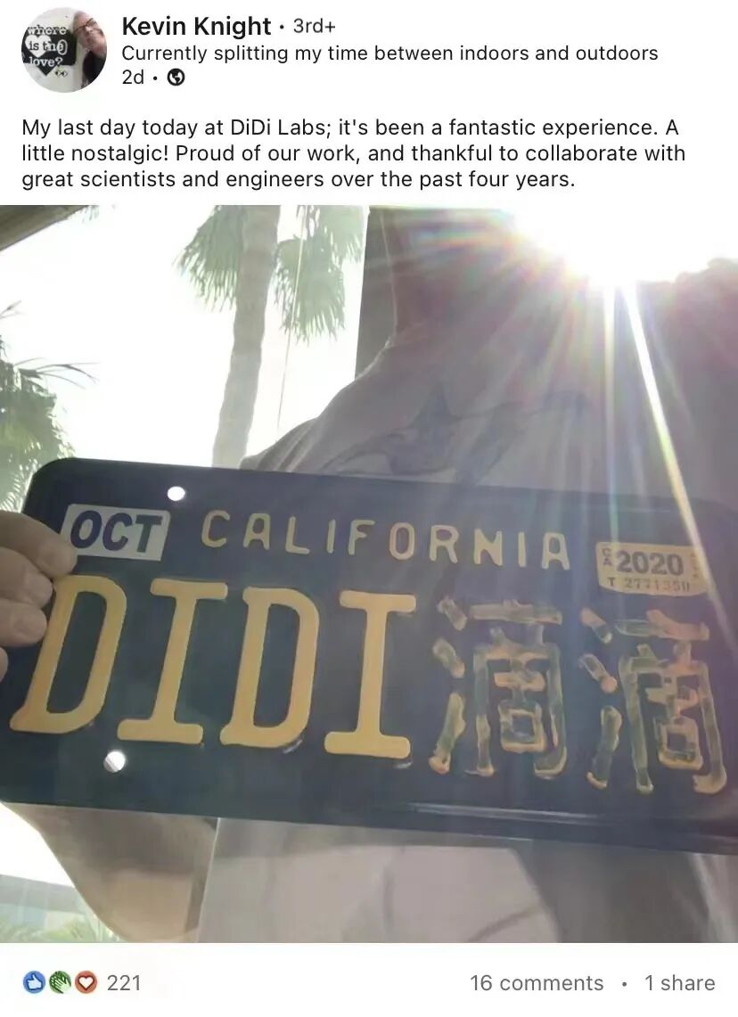 近日,原任滴滴实验室(洛杉矶)自然语言处理组首席科学家的 NLP 大神 Kevin Knight 在其领英页面宣布他将从滴滴实验室离职: