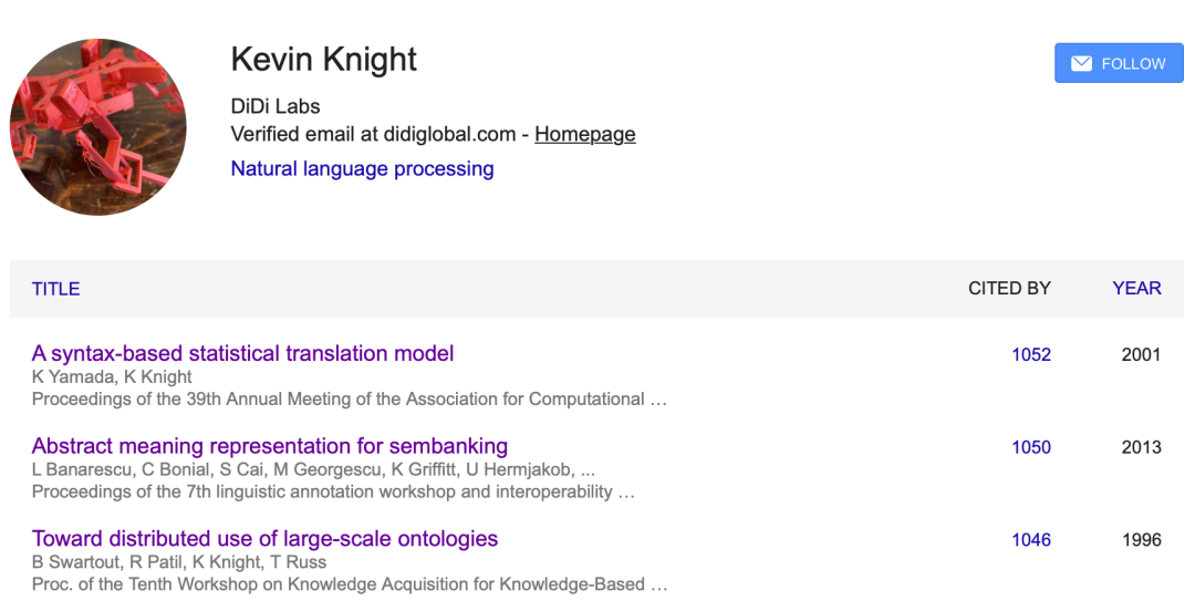 作为 NLP 领域的研究大神,Kevin Knight 的研究工作对同行具有极高的阅读与参考价值。他的被引数排名 TOP3 的论文分别如下: