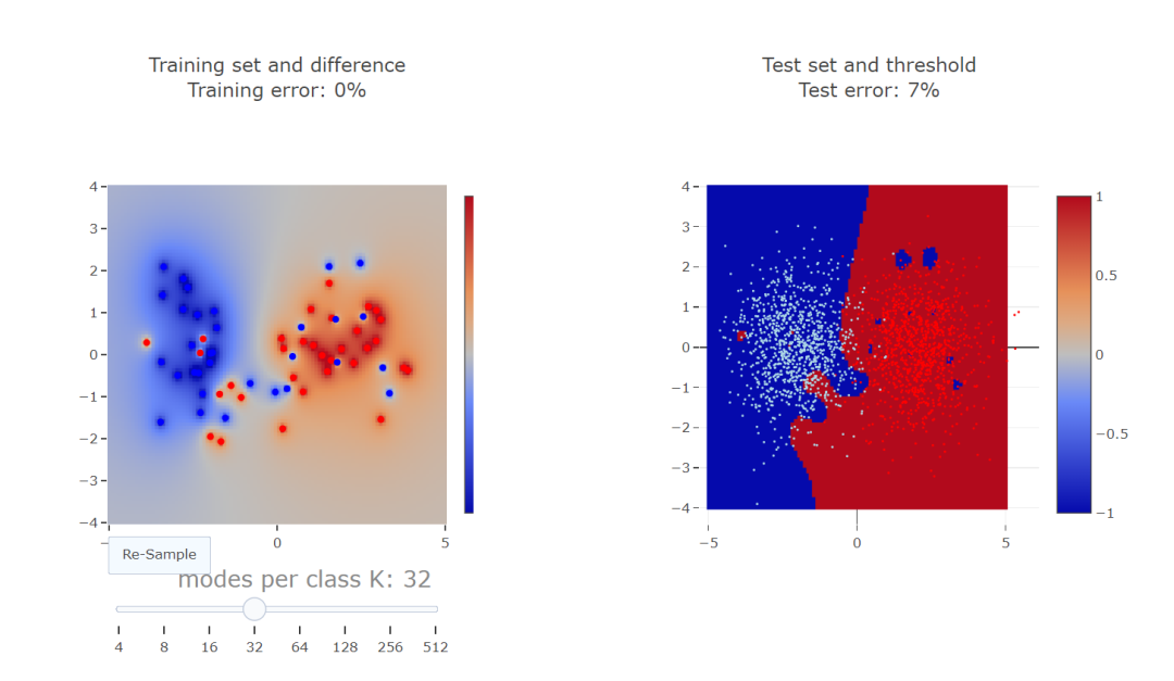 那么标签错误发生了什么呢? 标签错误会导致损坏的训练点附近的某些区域被分配给错误的类。然而,附近正确类的点越多,错误分类的区域就越小。我们可以交互地尝试。随着点数的增加,测试误差会减少。