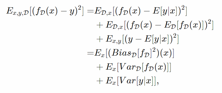 并利用 (x,y) 和D的独立性,我们可以将预测的期望平方误差分解为: