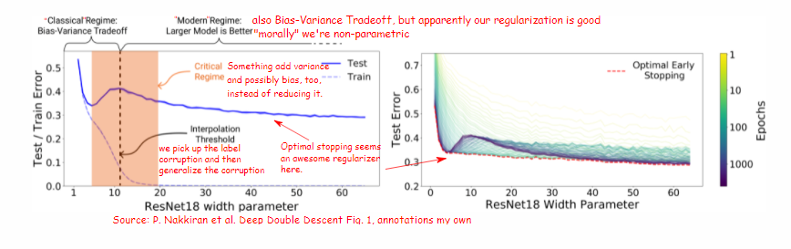 M. Belkin等人把条件中的“传统(classical)”和“现代(modern)”等限定词用引号括了起来。“现代”条件是一种十分之非参数的学习,具有一种我们还需要更加深入理解的正则化。