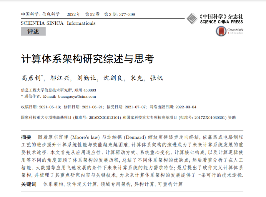 随着摩尔定律 (Moore’s law) 与迪纳德 (Dennard) 缩放定律逐步走向终结, 依靠集成电路制程 工艺的进步提升计算系统性能与效能越来越困难, 计算体系架构的演进成为了未来计算系统发展的重要技术途径. 本文首先从应用适应性、计算驱动方式、系统重心变化、计算核心构成, 以及计算逻辑使 用等不同的角度回顾了体系架构的发展历程, 总结了不同体系架构的优缺点; 然后着重分析了在人工 智能、大数据等应用飞速发展的条件下未来计算系统的能力需求特征; 最后提出了软件定义计算体系 架构, 并梳理了其重点研究内容与关键技术, 为未来计算体系架构的发展提供了一条可行的技术途径。