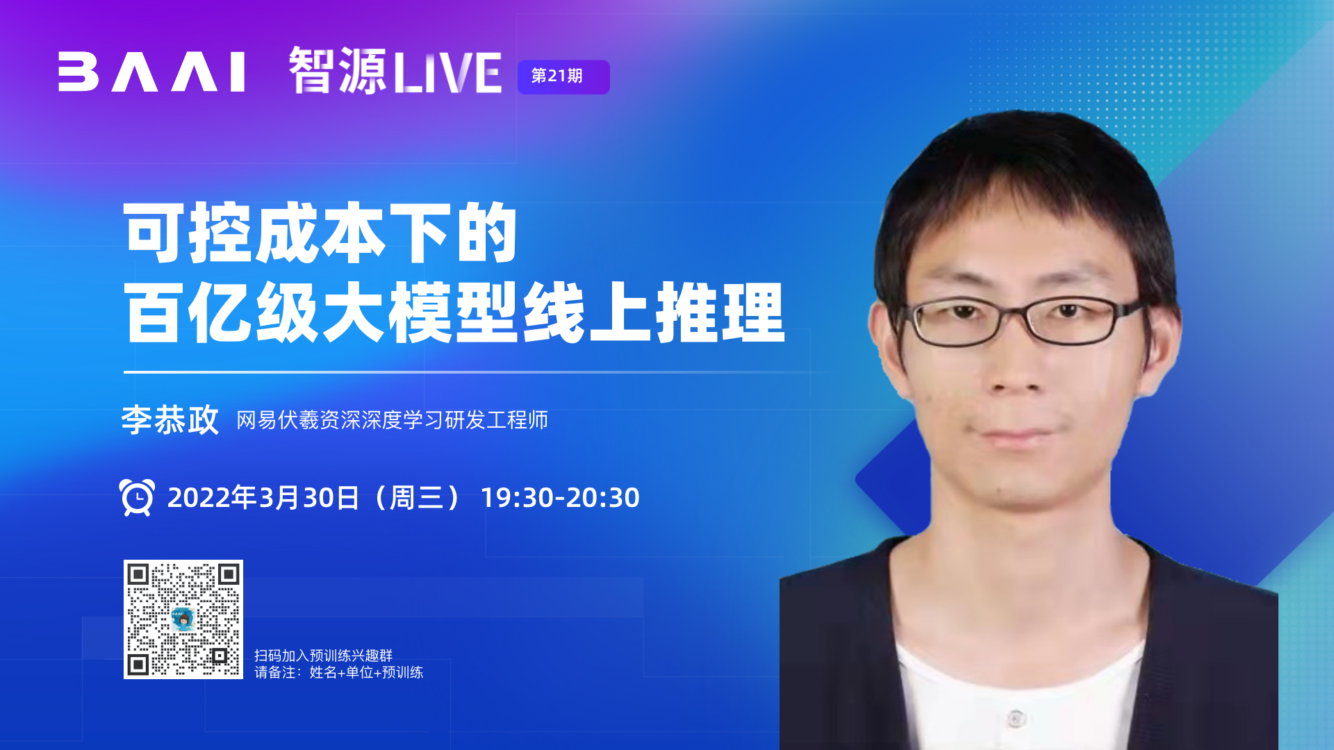 由智源社区举办的「智源LIVE 第21期 | 可控成本下的百亿级大模型线上推理 」将于3月30日(周三)19:30-20:30举办,网易资深深度学习研发工程师,李恭政作主旨报告,将介绍网易伏羲在GPT-3模型上的性能优化、显存压缩、模型量化等方面的技术进展。