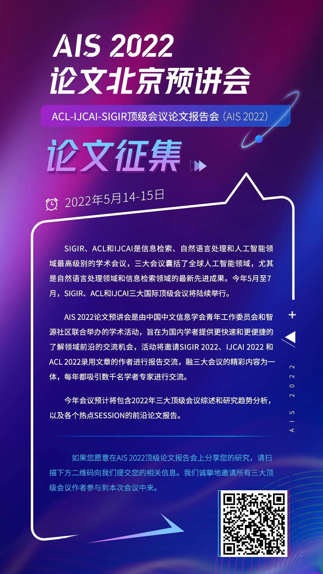如果您愿意在AIS 2022顶级论文报告会上分享您的研究,请扫描下方二维码向我们提交您的相关信息。我们诚挚地邀请所有三大顶级会议作者参与到本次会议中来。