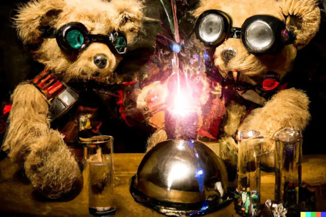 DALL-E 2输出的“泰迪熊像一个蒸汽朋克时代的疯狂科学家一样混合闪闪发光的化学物质”的结果