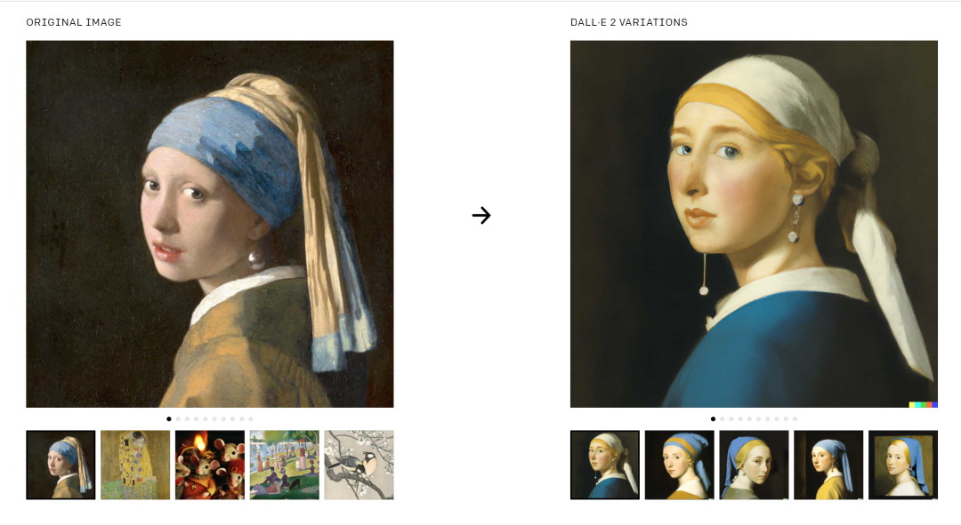 DALL-E 2还有一个功能是变体(variations),用户可以上传一张起始图片,然后创建一系列类似的变体,还可以混合两个图像,生成具有这两种元素的图像。