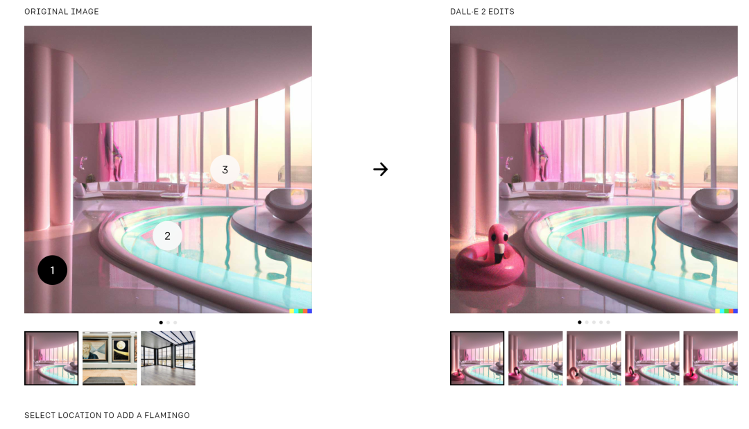 编辑功能的演示,DALL-E 2在一个现有图片的房间角落加一个火烈鸟摆设。