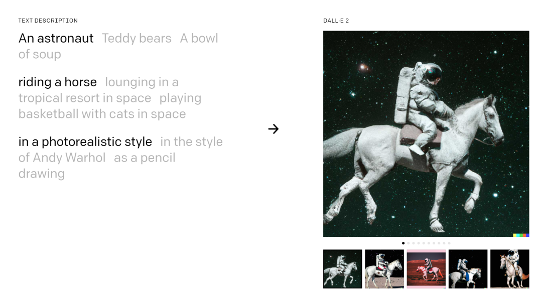 DALL-E 2的一个值得关注的新功能是编辑,用户可以从现有图片开始,选择一个区域,然后告诉模型对其进行编辑。