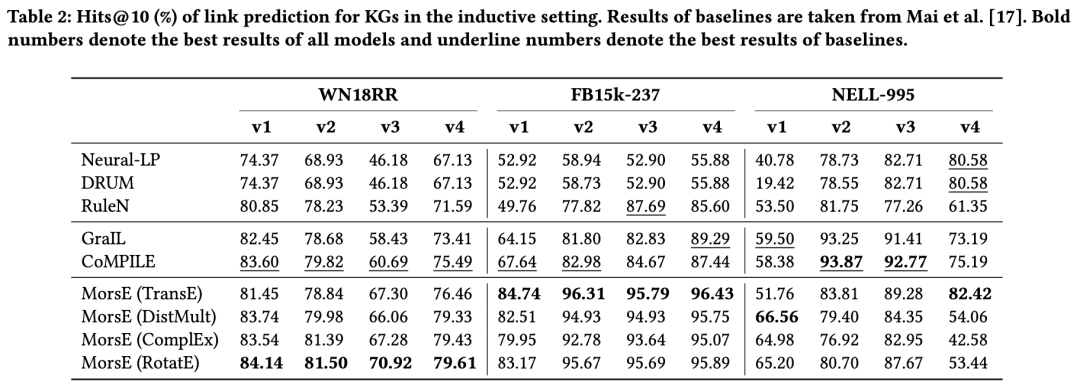 我们在一个in-KG的任务(链接预测)以及一个out-of-KG的任务(基于KG的问答系统)上进行模型的测试。对于链接预测,我们使用之前GraIL文章中提供的inductive数据集进行测试,实验结果如下
