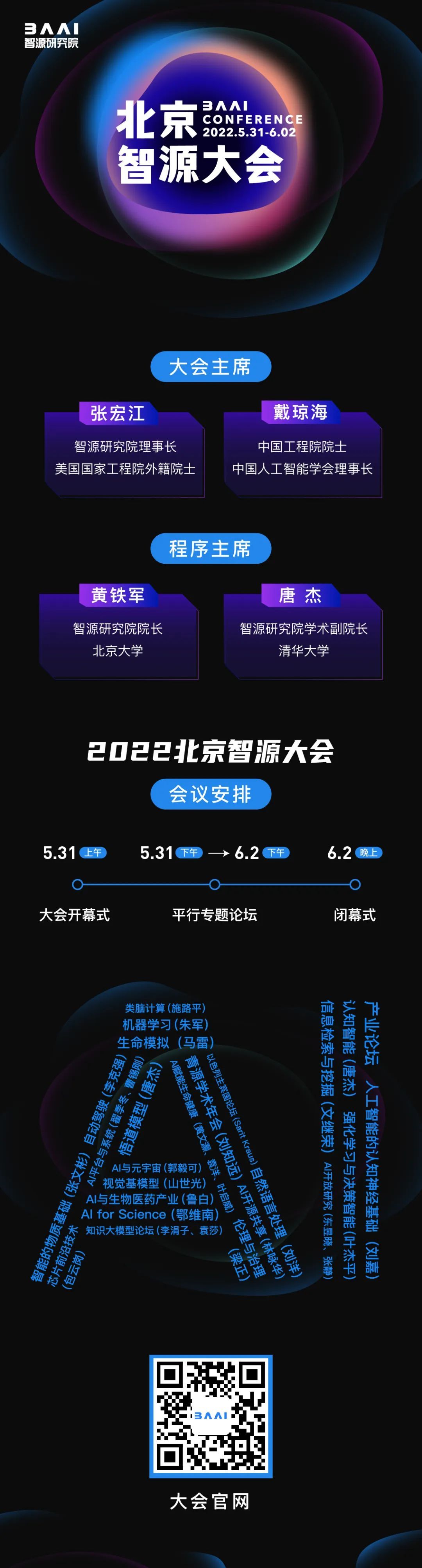 2022年5月31日-6月2日,第四届北京智源大会将同步向全球线上直播。本届大会共同主席由智源研究院理事长张宏江,中国人工智能学会理事长、中国工程院院士戴琼海教授担任。程序主席为智源研究院院长、北京大学教授黄铁军,智源研究院学术副院长、清华大学教授唐杰。