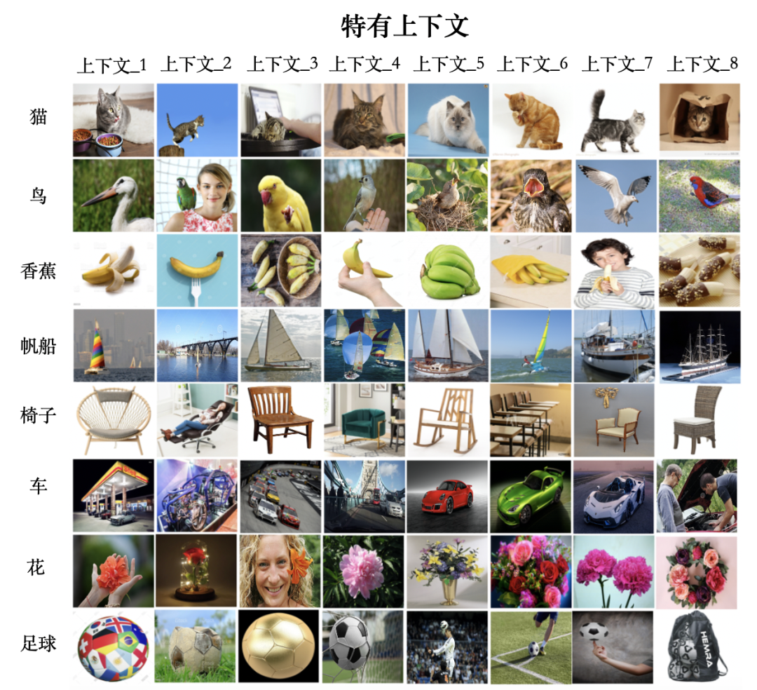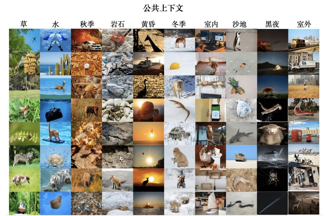 不同于NICO,NICO++包括公共上下文(common context)和特有上下文(unique context)两种上下文。其中,公共上下文同时出现在所有NICO++的类别中(支持公共上下文视觉泛化任务),包含自然环境、季节、人文环境、光照条件;特有上下文仅出现在相关类别里(支持混合上下文视觉泛化任务),例如属性、背景、拍着角度、常伴物体等。