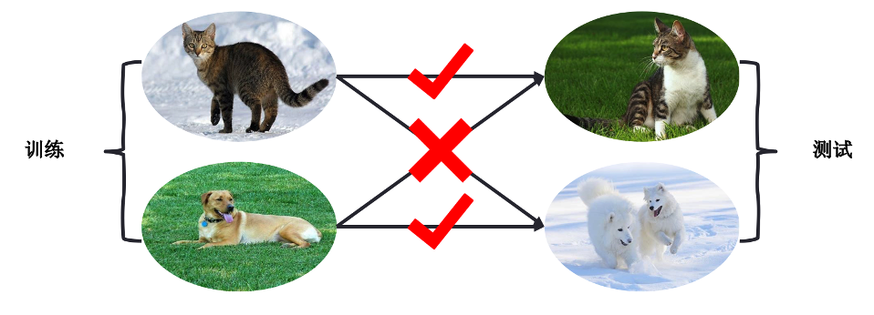 为什么传统机器学习模型容易在数据分布变化时失去泛化能力呢?目前研究界较为公认的原因是模型可能学到了数据中不具备泛化能力的虚假关联。例如下图所展示的例子,模型训练时看到的数据符合“狗大多在草地上、而猫大多在雪地上”的规律,为了最小化经验风险误差,模型就很可能把草地当作识别狗的要素;因此当测试模型遇见草地上的猫,它就会“指猫为狗”。