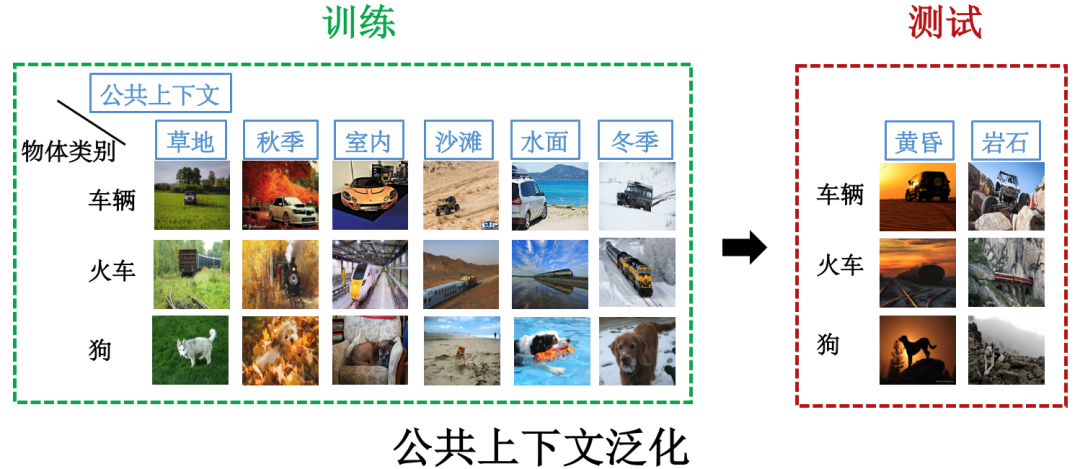 如下图所示,训练数据中的物体类别“车辆”,“火车”,“狗”都共享相同的公共上下文“草地”,“秋季”,“室内”,“沙滩”,“水面”,“冬季”,所以每个训练样本的标签都是二元组<物体类别,上下文类别>形式。本赛道旨在模拟真实应用中训练数据采样于若干已知领域(如若干不同搜索引擎,不同地点或不同季节等)且未知测试数据来源的场景。