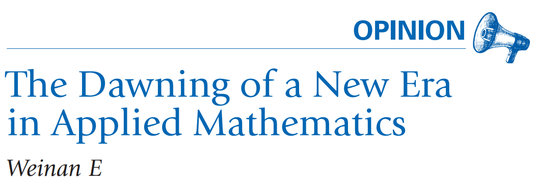 2021 年 4 月,美国数学会会刊 Notices of the American Mathematical Society 发表了鄂维南的观点性文章,题为《应用数学新时代的曙光》(The Dawning of a New Era in Applied Mathematics),获得领域内广泛关注。他在文中指出,我们正处在继牛顿和冯·诺依曼之后,应用数学发展的第三个高潮的前夕,机器学习将为高维问题的研究带来全新的机会。而应用数学将成为交叉科学的基础,并站到技术创新的最前沿。