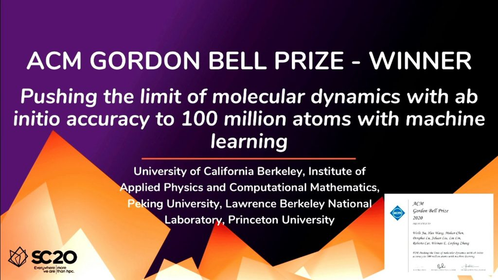 2020 年,包括鄂维南在内的“深度势能”团队获得了国际高性能计算领域最高奖,即戈登贝尔奖(ACM Gordon Bell Prize),他们利用机器学习方法将第一性原理精度的分子动力学的极限推到 1 亿个原子。