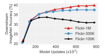 我们研究了回放缓冲区在使用单趟训练数据时的作用。我们使用 Flickr 数据集中序号为前 2 千万的图像,分别训练了使用/不使用回放缓冲区的 ResNet-18 SimSiam 模型。