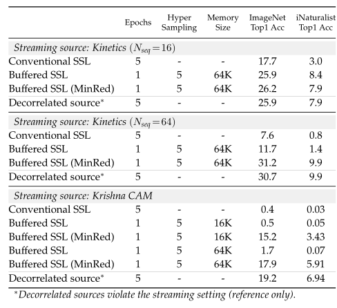 我们评估了自监方法在两种具有高度时间相关性的数据流上的性能。第一个数据流是通过连接 Kinetics 数据集中的视频样本创建的。我们从每个视频中随机采样帧,并将它们依次添加到数据流中。第二个训练流是 KrishnaCAM 数据集中的连续帧,记录了一名计算机视觉研究生九个月的以自我为中心的视频。我们分别在每个流数据上训练传统的 SimSiam、听过回放缓冲区增强的缓冲 SimSiam,通过 MinRed 缓冲区增强的 SimSiam。