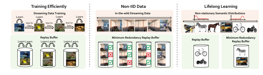 本文指出,直接将现有的方法应用于这种连续学习的设定存在以下问题:(1)计算效率低下、数据利用率低(2)在一些流数据源中,时间相关性(数据非独立同分布)导致表征较差(3)在具有非平稳数据分布的数据源上进行训练时,展现出灾难性遗忘的迹象。我们作者提出使用回放缓冲区(replay buffer)来缓解低效和时间相关性问题。我们进一步提出了一种新的方法,通过保留最少的冗余样本来增强回放缓冲区。最小冗余(MinRed)缓冲区让我们即使是在由单个具身智能体获得的序列化视觉数据组成的最具挑战性的流场景中,也可以学习到有效的表征,并缓解利用非平稳语义分布的数据学习时的灾难性遗忘问题。