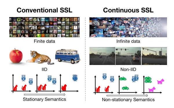 图注:传统自监督学习与持续自监督学习对比。传统自监督学习设定下,数据集是固定的。而自然场景下持续收集到的数据是无限、非独立同分布、具有非平稳语义的。因此,传统设定很难作为自然场景下部署的自监督学习的对比基准。