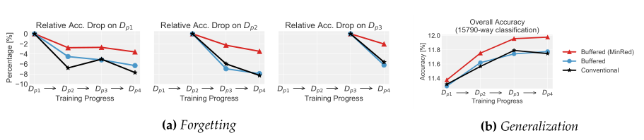 图注:完整 ImageNet 数据集上的持续无监督表征学习实验结果。(a)在每个任务的数据上训练,测量在其它每个任务上的准确率下降情况。最小冗余缓冲区可以保留先前任务的实例,因此缓解了传统自监督学习中的灾难性遗忘问题,能够有规律地回放缓冲区中的内容。(b)15,790 个类别上的整体准确率。通过确保来自过去类别分布的图像没有被遗忘,最小冗余缓冲区可以学习更好的总体表征。
