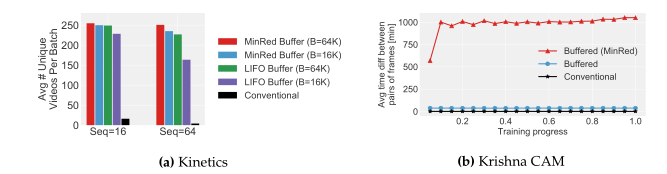 如上图所示,MinRed 回放缓冲区中的内容比 FIFO 缓冲区中内容的相关性明显较低。在使用 KrishnaCAM 数据集时,MinRed 缓冲区能够维护过去更长的时间内的独特帧。在使用 Kinetics 数据集时,MinRed 缓冲区用可以产生包含更多独特视频中的帧构成的训练用 mini-batch。