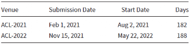 相比之下,在 ACL 2021 中,从提交到通知的时间为 92 天,几乎是 ARR 目标的3倍。但是 ACL-2022 使用了 ARR 而 ACL-2021 没有。如果 ARR 真的快了3倍,为什么表2的时间表中没有出现这种加速?