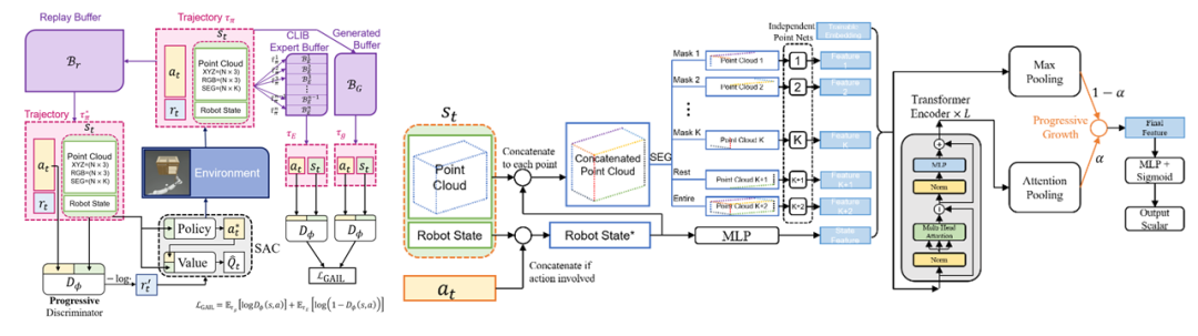 针对这样的情况,我们的工作提出了一种基于模仿学习 imitation learning 的类别级物体操控策略学习方法。我们以 model-free 强化学习中的SAC算法结合生成对抗模仿学习(GAIL)算法作为基线模型。