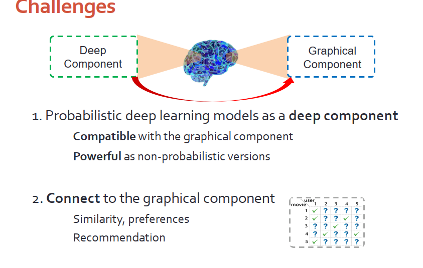 我们提出的框架是贝叶斯深度学习。有两个模块:深度模块,用概率型的深度模型表示;图模块,即概率图模型。深度模块处理高维信号,图模块处理偏推断的任务。