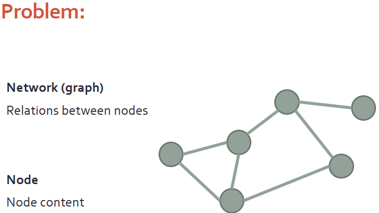给定一个图,我们知道边,并了解节点的内容。此图如果是社交网络,其实就是表示着用户之间的朋友关系,节点内容就是用户贴在社交平台上的图片或者文本。这种图关系,也可以表示论文的标题、摘要、引用等等联系。