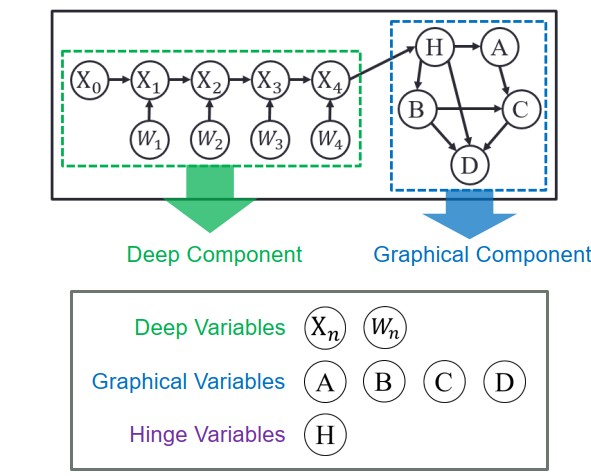 具体到模型细节,我们将概率图模型的变量分为三类:深度变量,属于深度模块,假设产生于比较简单的概率分布;图变量,属于图模块,和深度模块没有直接相连,假设它来自于相对比较复杂的分布;枢纽变量,属于深度模块和图模块中相互联系的部分。