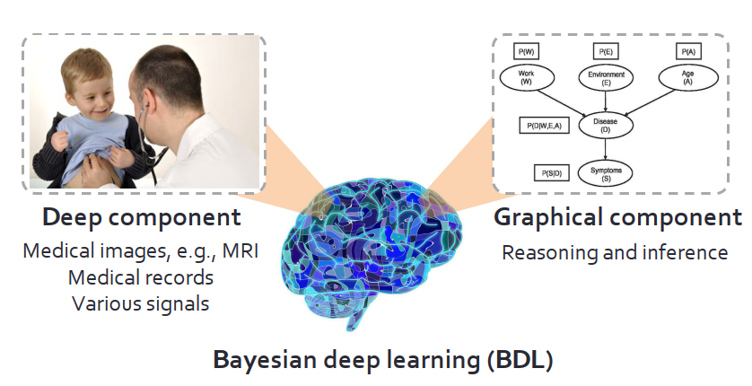 基于贝叶斯深度学习概率框架方法,用深度模块处理非常高维的信号信息,用图模块对在医疗专有知识进行建模。