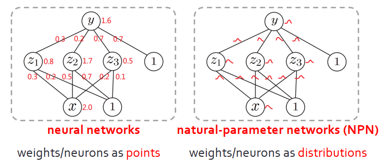 我们的关键思路是:把神经网络的神经元以及参数,看成分布,而不是简单的在高维空间的点或者是向量。允许神经网络在学习的过程中进行前向传播、后向传播。因为分布是用自然参数表示,该方法命名为NPN(natural-parameter networks)。
