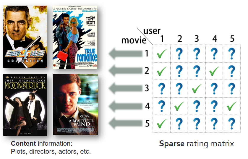 可以将用户对电影的喜爱写成评分矩阵(Rating Matrix),该矩阵非常稀疏,用来直接建模,得到的准确性非常低。在推荐系统中,我们会依赖更多的信息,例如电影情节、电影的导演、演员信息进行辅助建模。