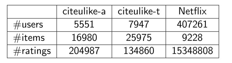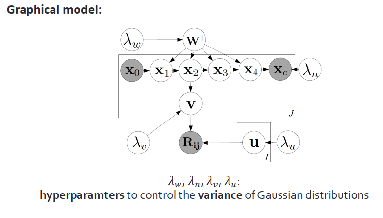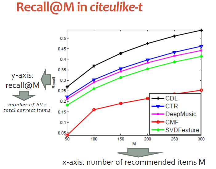 上图是整个模型的图解,其中λ是控制高斯分布方差的超参数。为了评测模型效果,我们用了三个数据集:citeulike-a、citeulike-t、Netflix。对于citeulike是用了每篇论文的标题和摘要,Netflix是用电影情节介绍作为内容信息。