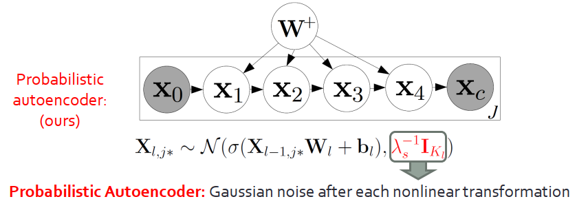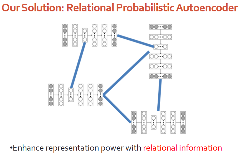 解决方案是基于贝叶斯深度学习框架,设计关系型的概率自编码器。深度模块专门负责处理每个节点的内容,毕竟深度学习能够在处理高维信息是有优势的;图模块处理节点节点之间的关系,例如引用网络以及知识图谱复杂的关系。