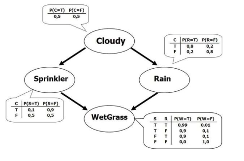 如上图,概览图示例。任务是:想通过目前草地上喷头开或关,以及外面的天气来推断外面的草地被打湿的概率是多少,也可以通过草地被打湿反推天气如何。概率图的缺点是无法高效处理高维数据。