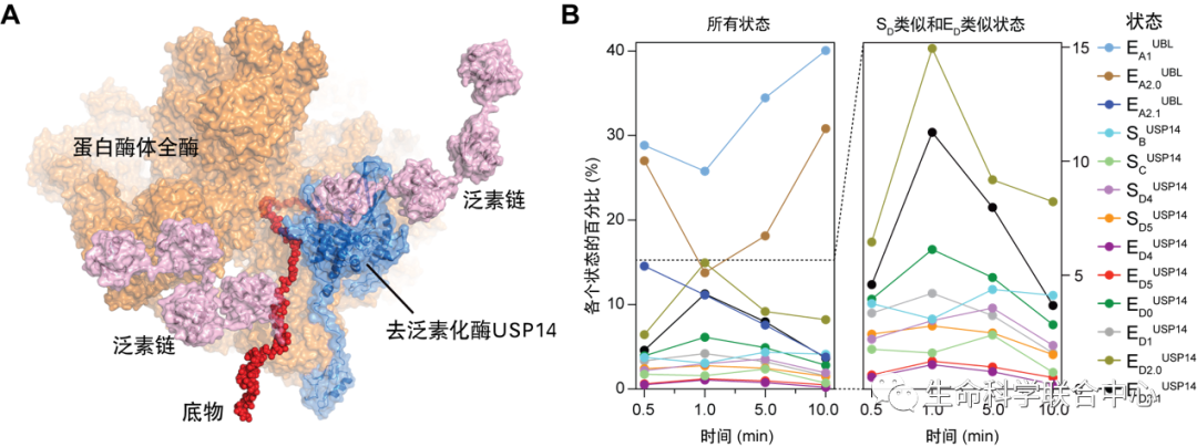 图1.(A)USP14调控下蛋白酶体复合体降解多泛素化底物的原子结构模型之一。(B)时间分辨率冷冻电镜解析13种中间态的统计分布随蛋白质降解进程的时间演化。(图片来源: YoudongMao, CC BY 4.0)