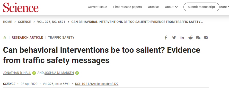 不过,根据Science最近发布的一项研究显示,这种警示牌不仅不会让交通事故的数量降低,反而会提高。