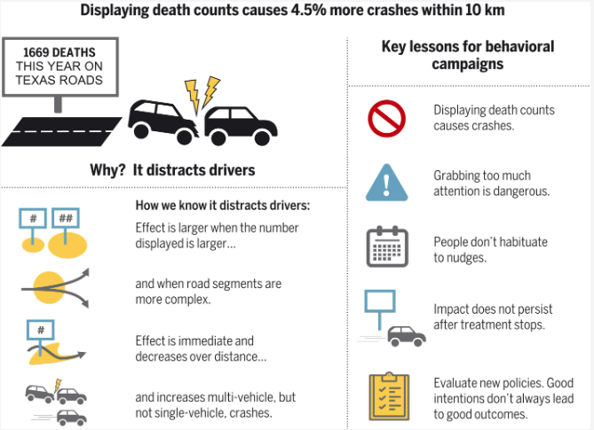 在论文中,研究人员展示了“反常识”的结果:在对844,939起事故的分析表明,在这些标志的下行10公里处,当这些死亡数字显示时,撞车事故增加了1.35% 。