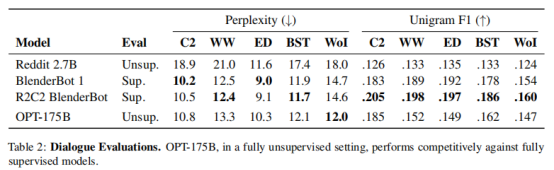 在对话任务中,采用无监督学习的方法训练OPT-175B,效果和监督学习训练的几类模型相近: