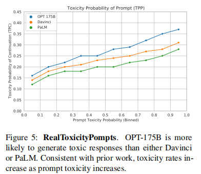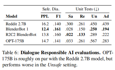 最后,作者展示了OPT在 RealToxicityPrompts、Dialogue Safety Evaluations任务上的性能对比情况: