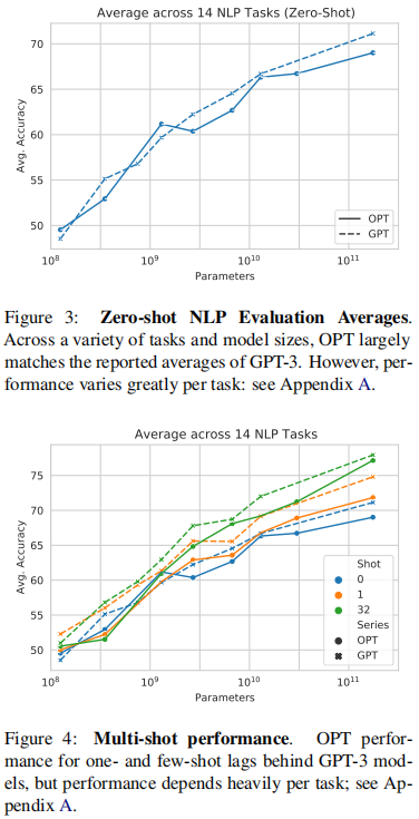 作者首先给出了零样本学习设定下14个任务的实验展示,结果表明,无论是零样本学习(zero-shot)还是多样本学习(Multi-shot),OPT在这些任务上的平均精度都与GPT-3相差不大。其中虚线为GPT,实线为OPT: