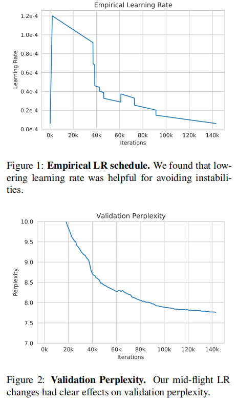 作者还进行了一些其他的实验变化来优化损失差异的收敛。包括:应用普通的SGD(优化过程很快到达瓶颈,因此重新使用AdamW);重置动态损失标量(这有助于环节损失函数的部分发散情况);切换到新版本的megatron(提高了吞吐量)。