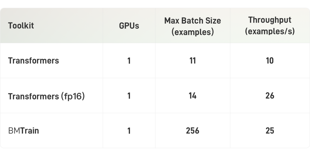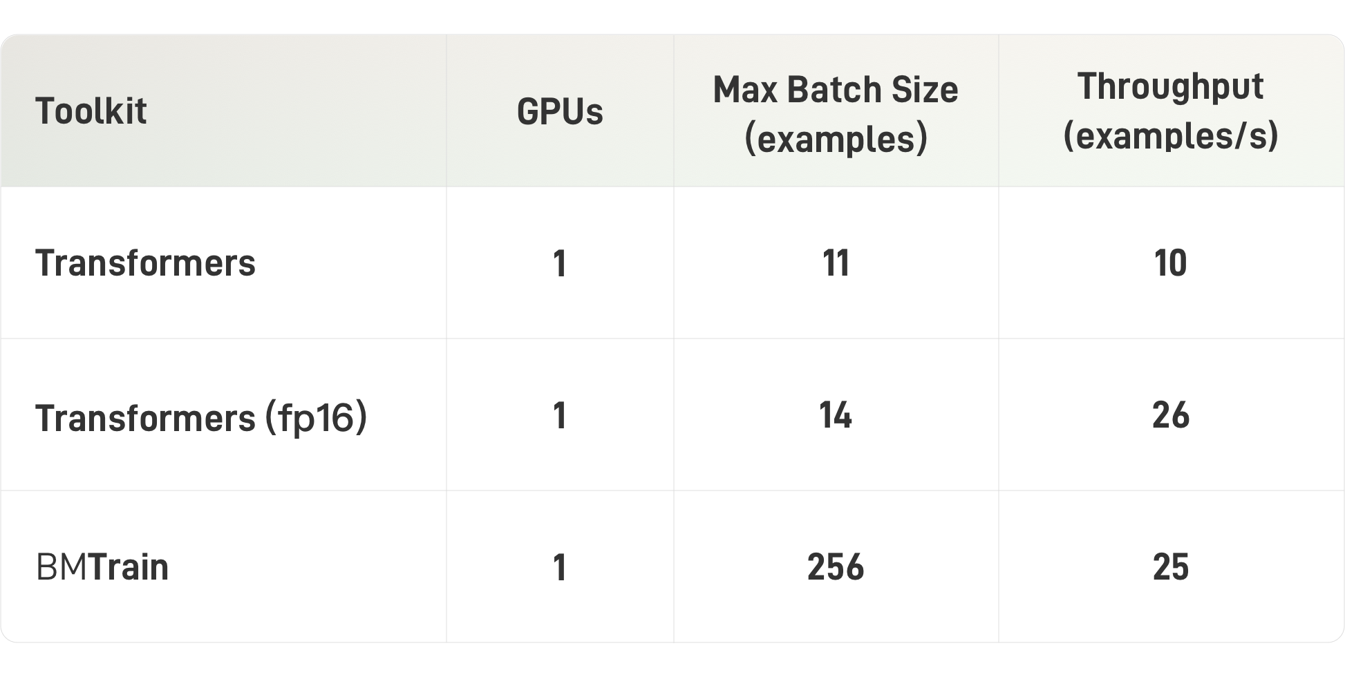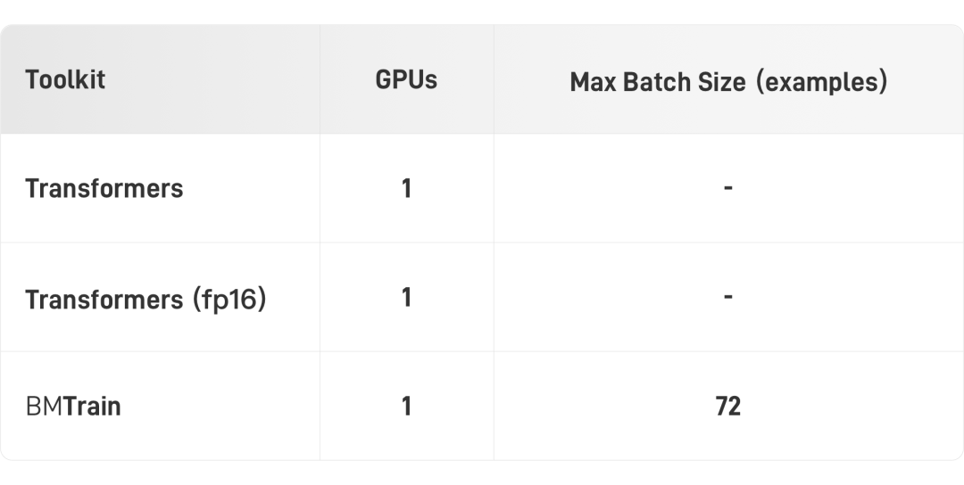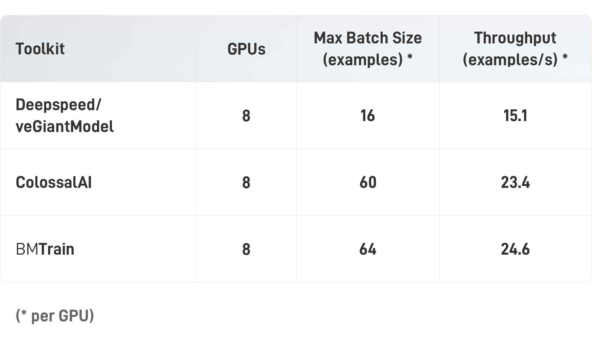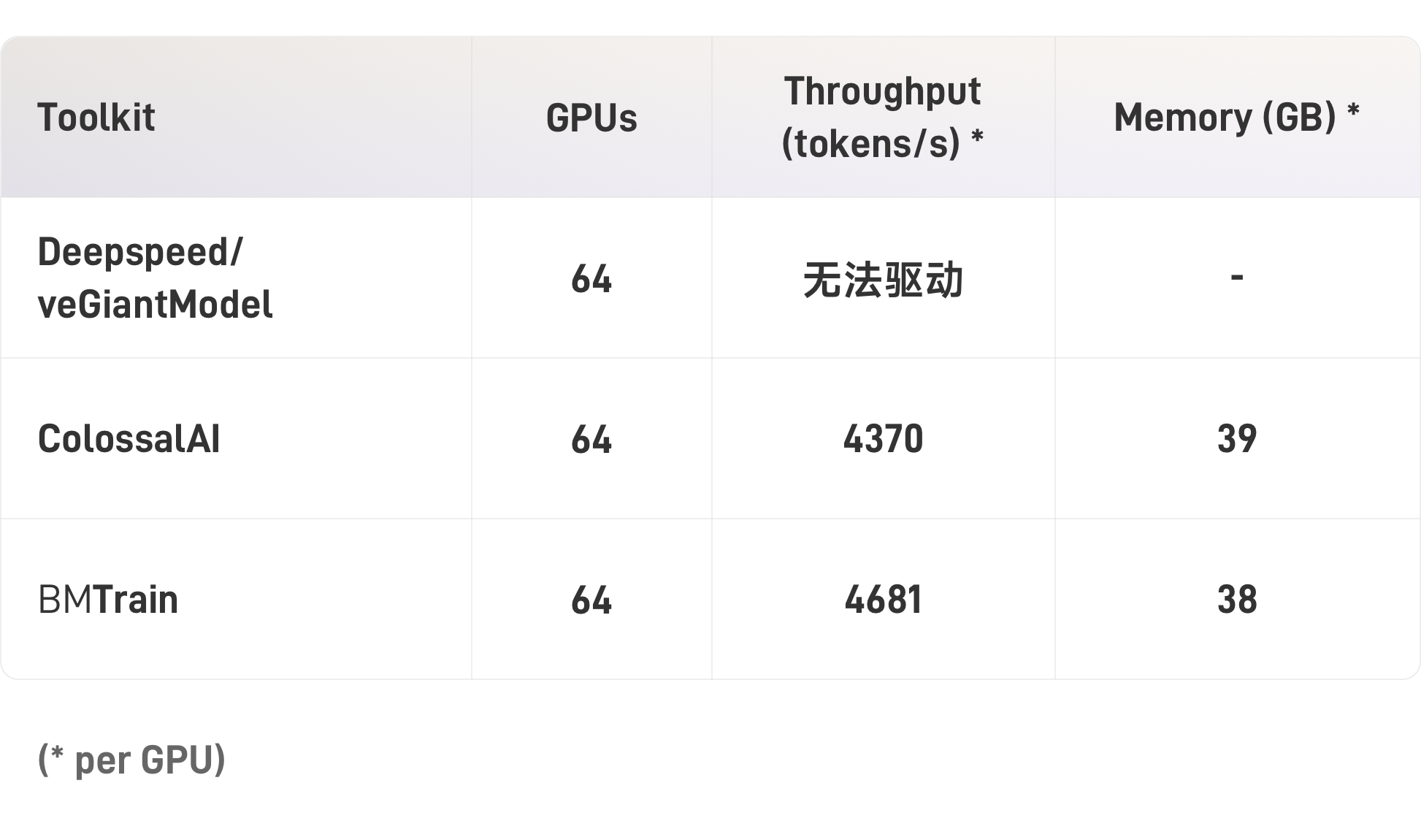 在中等规模算力条件下(显卡为A100 40GB,NVLink),BMTrain可以训练大规模的 GPT-13B (130亿参数,样本长度 512)。